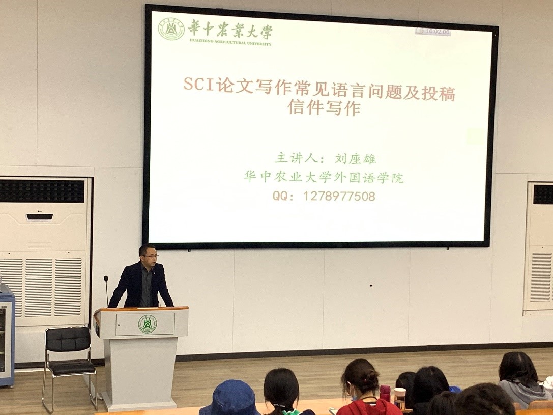 10月29日下午,由太阳成集团tyc122ccvip研究生院、tyc122cc太阳成集团和植物科学技术学院联合主办的农科学术英语论文写作系列讲座第三讲如期在第三教学楼S2报告厅举行。本次,tyc122cc太阳成集团刘座雄副教授受邀作题为“SCI论文写作常见语言问题及投稿信件写作”的专题讲座。