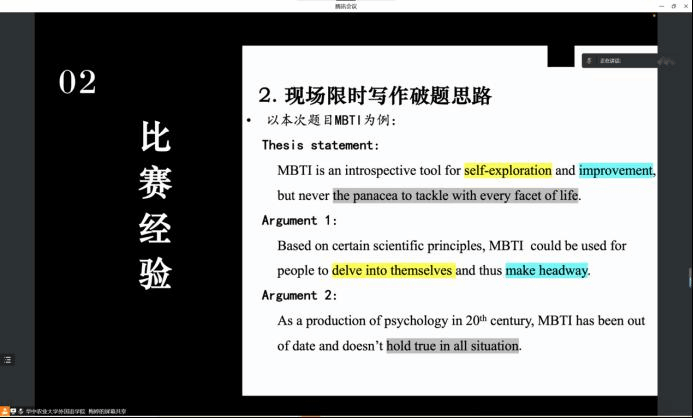 关于此次参赛的一些经验,郑斯媛首先向大家说明了有关机器评分的注意事项和写作技巧。她强调,大家平时要夯实基本功,切忌拼写与语法错误,在保证句子正确的基础上再运用长短句、从句、强调句等,同时变换句子开头,使文章的句型多样化。她认为文章的篇章结构与整体性十分重要,不同类型文章有不同的结构,要学会运用连接词实现逻辑和语言的连贯性。她还向大家介绍了现场限时写作的破题思路,强调要合理分配写作时间,并以本次写作大赛赛题为例,向大家介绍了英语议论文、文化类和图表类说明文、信件类应用文的写作思路和文章架构。她提到,一些写作技巧的运用也是很有必要的,如同义替换、词性转换、修辞手法等,可以展现自己的文采。