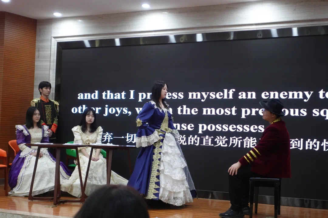 据评委老师介绍,英语戏剧比赛是国家级一流课程《英国文学导读》课内课外一体化的课程实践项目之一,三年级所有同学都要参加,通过初选,最终十二支队伍参加决赛。比赛除了戏剧表演之外,还可以进行诗歌朗诵。同学们通过戏剧表演与诗歌朗诵等沉浸式学习方式,对英国文学作品有了更深刻的理解,对作品主题、人物塑造有了更准确的把握。文学教学团队通过精心设计课程实践项目,让同学们在沉浸式学习中进一步夯实人文底蕴,育心育情育行。