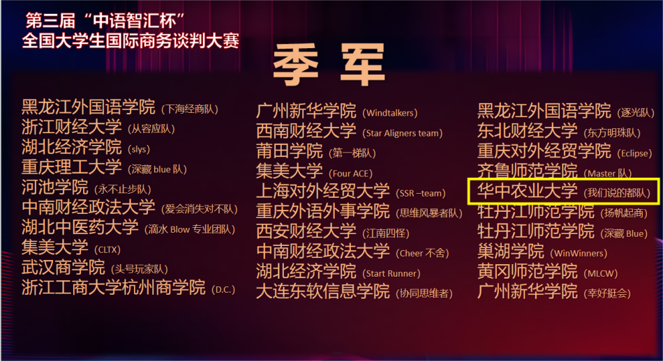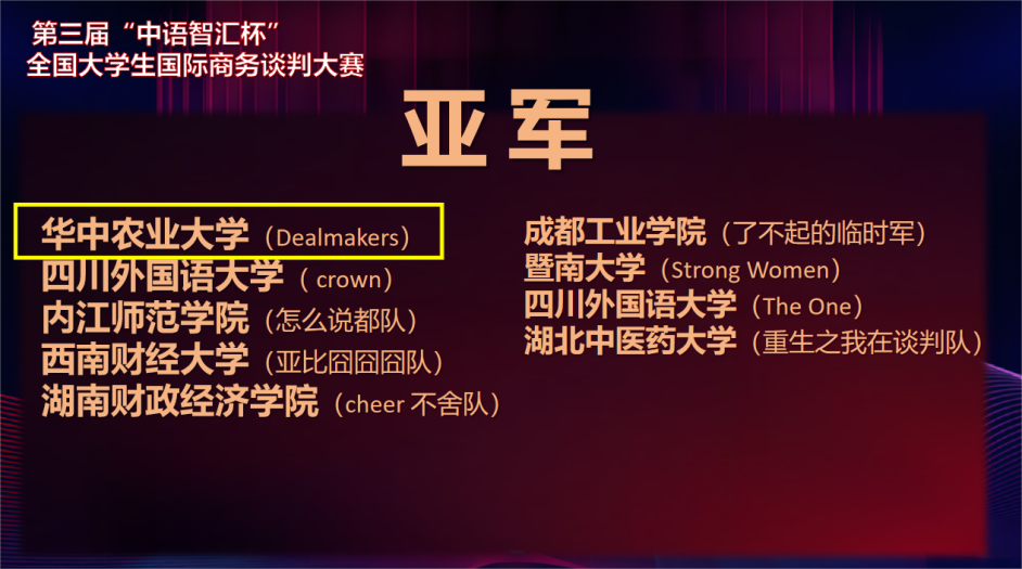 2024年11月10日,由中外语言文化比较学会、四川外国语大学和中语智汇科技(厦门)有限公司联合主办的第三届“中语智汇杯”全国大学生国际商务谈判大赛全国决赛圆满落幕,我院参赛的三支队伍分获全国亚军、全国季军、区域赛二等奖各一项。