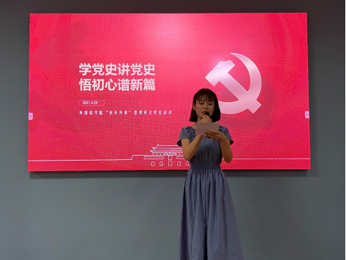 来自英语1901班的王先觉同学结合自己乘坐绿皮火车的体验以及父亲在扶贫时的一些经历,表达了自己对党的宗旨的深刻理解。外文2004班的贾婷婷同学通过讲述一位支教老师的动人故事,展现党员扎根基层的奉献精神,并号召大家学习党史,共同奋进。