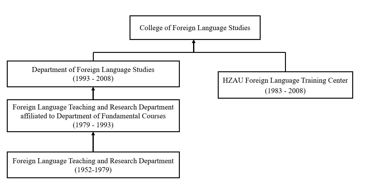 In June 1993, Foreign Language Teaching and Research Department and Foreign Language Training Centered merged into Department of Foreign Language Studies concerning domestic needs for high-end foreign language talents. This institution is now known as HZAU College of Foreign Language Studies since February, 2008. The College, composed of Department of English Language Teaching, Department of Business English, Department of College English Studies (a combination of Department of College English for Undergraduates and Department of College English for Graduates), Master of Translating and Interpreting Education Center and Foreign Language Experimental Teaching Center, is divided into 11 basic teaching units and strives to provide quality teaching by vigorous educational reforms at all levels. In recent years, both Department of College English Teaching and Department of English Language Studies are awarded as Provincial-Level Excellent Teaching and Research Departments.